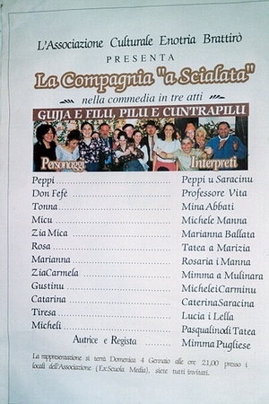 Commedia di Natale 2003 "a scialata" (La ricreazione festosa) _________________ Ambientazione e Trama dell'Opera di Mimma Pugliese La vicenda si svolge verso la fine degli anni cinquanta a Brattirò, un paese come tanti, della Calabria. I fatti sono legati alla tradizione ed alla mentalità del luogo e di quegli anni. La commedia è stata scritta proprio con l'intento di ricordarle e consegnarle alle giovani generazioni, con la speranza che in questa fuga del tempo verso il domani che diventa subito oggi, non vadano perdute, convinti che le nostre radici devono essere un punto fermo nella nostra vita e che la conoscenza di quello che siamo stati ci aiuta a capire meglio chi siamo e chi saremo. La scena è ambientata............... su quell'amore sfortunato. |