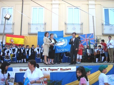 43. Scuola Ambasciatrice dell'Infanzia “Per l’impegno dimostrato a favore dell’infanzia di tutto il mondo e per aver diffuso il messaggio Unicef di solidarietà e di pace”. Questa la motivazione scritta sull’attestato donato dall’Unicef alla Direzione Didattica “A. Pagano”, diretta dalla dott.ssa Violetta Pasqua, conferendo alla scuola nicoterese il titolo di “Scuola Ambasciatrice dell’Infanzia”. L’alto riconoscimento è stato consegnato durante la manifestazione “Una Scuola per amica” organizzata con il patrocinio dell’Amministrazione Comunale, dell’Ente Provincia e del Comitato Provinciale Unicef. La giornata coordinata dall’insegnante Gaetano Aurelio, funzione strumentale per le politiche sociali, è iniziata con il raduno di tutti i ragazzi della scuola dell’infanzia e primaria rigorosamente in maglietta bianca simboleggiante la purezza dei fanciulli. Sul palco, il Dirigente scolastico, dott.ssa Pasqua, grata e orgogliosa di tale riconoscimento, ha ricevuto l’attestato da parte del Presidente del Comitato Provinciale Unicef, prof.ssa Cinzia Catanoso la quale si è voluta soffermare sui vent’anni di collaborazione fra la Direzione Didattica e l’Unicef. Presenti alla manifestazione in rappresentanza dell’Amministrazione Provinciale, il consigliere Salvatore Rizzo, la dott.ssa Maria Giovanna Fusca, componente del Direttivo Nazionale Unicef e l’Assessore alla pubblica istruzione, prof.ssa Maria Teresa Mercuri, la quale ha consegnato alla Direzione Didattica una targa di riconoscimento per l’impegno profuso negli anni a favore dei bambini più bisognosi. Ad allietare la serata, con canti e balli del repertorio calabrese, il gruppo Folk “Medma” della stessa scuola nicoterese. A conclusione, sono stati aperti i numerosi stands di giocattoli, lavori artigianali, quadri e stampe, lavoretti scolastici, libri per l’infanzia, tutto generosamente messo a disposizione dagli stessi ragazzi, dai genitori, dagli insegnanti, dalle associazioni della comunità per contribuire alla raccolta fondi per l’Unicef . Anche grazie a questa manifestazione la scuola primaria “A. Pagano” ha raggiunto il difficile obiettivo di coinvolgere i ragazzi nel mondo della solidarietà semplicemente offrendo ciò che possedevano e donando a chi è meno fortunato di loro. Orsolina Campisi Torna all'indice |