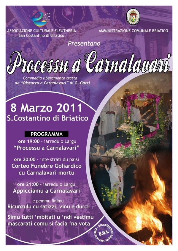 Comunicato Stampa "CARNEVALE TRADIZIONALE" DI San Costantino di Briatico L’Associazione Culturale Eleutherìa e la Comunità di San Costantino con il patrocinio del Comune di Briatico presentano l’edizione 2011 del CARNEVALE che si terrà martedì 8 marzo a partire dalle 19.00. Reduci dal successo delle edizioni degli anni scorsi e compiaciuti della viva partecipazione di tutta la cittadinanza e dei tanti visitatori, il gruppo si è posto l’obiettivo di far rivivere la tradizione del Carnevale come avveniva negli anni Trenta. Si risvegliano dopo un lungo letargo durato più di sessanta anni i vari personaggi della storia di Carnevale. Riprendono vita i becchini che trasportano il "catalettu" su cui è adagiato Carnevale seguito da tutta la folla che simula pianti grotteschi (cuvali); il prete che recita in latino maccheronico e incensa con fumo proveniente dalla combustione di polvere di peperoncino ed incenso; la moglie di Carnevale, Corajisima, vedova inconsolabile e la figlia rientrata per l'occasione dal convento. Circondano la bara i membri della confraternita vestiti di bianco. Personaggio non di secondo piano è il medico, "lu gran dutturi, lu medicu di tutti li chiamati", "chi visitava li megghiu signori" ma "l'omani mancu li toccava" e preferiva "malati fimmani di chiji joculani, giovani e puliti", "ordinava tanti medicini, tantu ncuna nci ha di giuvari". Il rito si arricchisce della messa in scena, all'aperto, di "U processu a Carnalavari" una commedia liberamente tratta dal poemetto in vernacolo "discurzu a carnalavari" di G. Garrì. Gli attori sono comuni cittadini di San Costantino di Briatico che per una sera raffigureranno i popolari antenati protagonisti del Carnevale che affonda le proprie radici negli anni Trenta. Con il recupero della tradizione del Carnevale si vuole altresì fare omaggio alla memoria di Grazioso Garrì, cittadino di San Costantino di Briatico, autore e declamatore di un poemetto satirico in vernacolo del 1930 dal titolo "Discurzu a Carnalavari" declamato in piazza nel giorno di "carnalavari", recuperato e curato dal figlio, il Prof. Garrì Giuseppe, collaboratore in passato dell'illustre Prof. Luigi Maria Lombardi Satriani. "Oggi - scrive il Garrì - a distanza di poco più di mezzo secolo, poco o nulla rimane di quel mondo arcaico che improntò la vita quotidiana delle generazioni passate. Non senza rimpianto dobbiamo prendere atto che è definitivamente tramontata un'epoca. Un'epoca fatta per molti versi di privazioni e di stenti, ma anche di appartenenza e di aggregazione che aveva lo straordinario potere di animare la vita di un villaggio e di dare un senso alla grama quotidianità. L'evoluzione dei tempi ci ha fatto conoscere un relativo benessere materiale, ma nello stesso tempo ha cancellato tradizioni e costumi che avevano un'intrinseca valenza umana e culturale di cui tutti avvertiamo oggi la mancanza, ma che forse non riusciremo più a fare rivivere” Un grazie da parte dall’Associazione Culturale Eleutherìa è rivolto a tutta la comunità di San Costantino e in particolare a chi ha speso il proprio tempo, le proprie energie, e le proprie idee nella realizzazione di questo evento. Di seguito il programma della manifestazione: