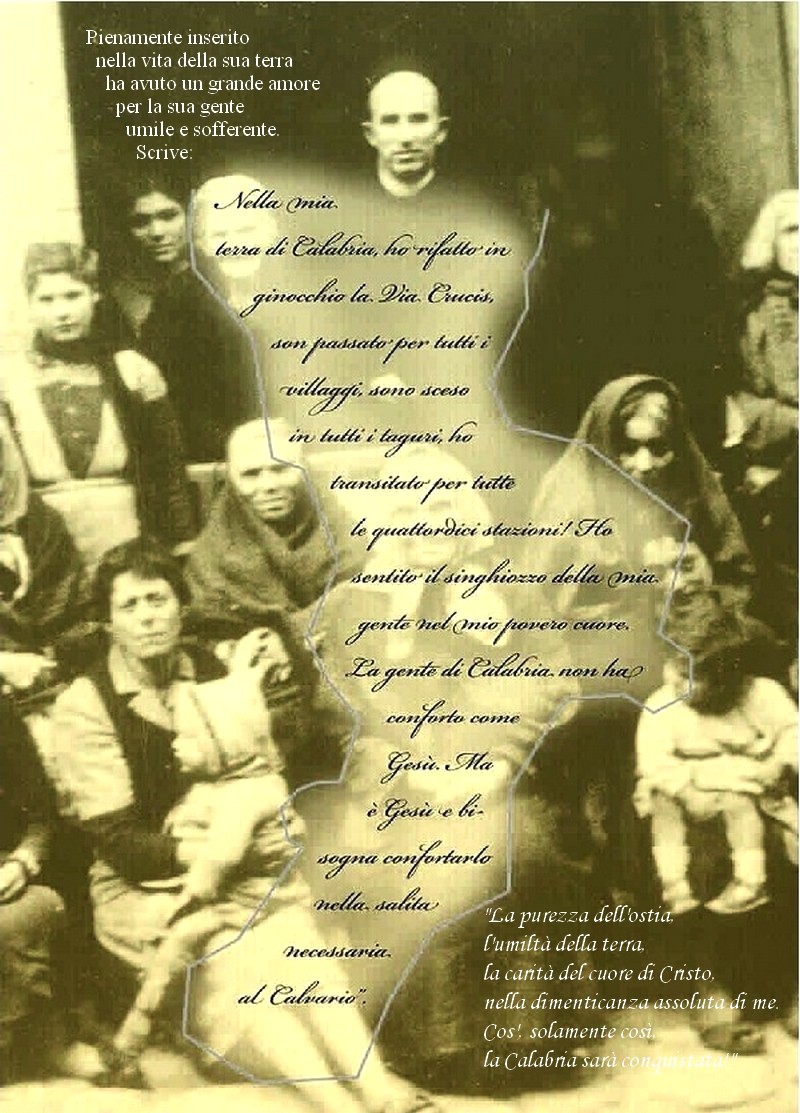 LA VITA SACERDOTALE E L’IMPEGNO APOSTOLICO. Don Mottola cominciò subito a manifestarsi attivissimo, anche se era solito dire che non bisogna mai lasciarsi sfibrare dal lavoro che va sempre a detrimento dello spirito, convinto com’era che la vita cristiana deve essere sintesi di contemplazione e azione e che tutto trova senso nella Carità di Cristo. La Messa era al centro della sua giornata; scrive nel suo diario: “La santa Messa sarà al centro della mia attività sacerdotale. In preparazione ad essa mi serviranno tutte le azioni dal momento del pranzo in poi… come ringraziamento tutte le preghiera liturgiche e le azioni fino al pranzo.” Dal 1929 al 1942 fu chiamato a dirigere il Seminario vescovile di Tropea e nonostante tutti gli impegni che via via veniva assumendo diede tutto se stesso per i seminaristi seguendoli con amabile paternità. Li chiamava a colloquio personale con lui e interpellava i responsabili del seminario su ciascuno di essi, premuroso e attento in tutto sempre con dolcezza e fermezza. Si distinse come assistente diocesano della Gioventù maschile di Azione Cattolica in seno alla quale formò un gruppo di volontari che l’accompagnavano nelle case più povere della città per portare un poco di conforto materiale e morale ai più disagiati e da cui sbocciò l’opera della Casa della Carità. Nel maggio del 1931 fu nominato Penitenziere della Chiesa Cattedrale di Tropea. Fu un confessore ricercato e apprezzato perché sapeva trattare le persone con delicatezza e fermezza; la sua bontà, il suo tatto e la sua umiltà facevano accettare da lui ciò che difficilmente sarebbe stato accettato da un altro. Non perdeva mai la pazienza. Finché, in seguito alla paresi che lo colpì, non perse l’uso della parola, don Mottola fu un apprezzato predicatore e conferenziere che si esprimeva con profondità di dottrina ed estrema chiarezza e semplicità. Predicò spesso gli Esercizi spirituali ai sacerdoti e partecipò come relatore a numerosi convegni regionali e nazionali di Azione Cattolica, dove più volte stupì la platea con l’idea, rivoluzionaria per i tempi, che anche i laici erano chiamati alla preghiera contemplativa.